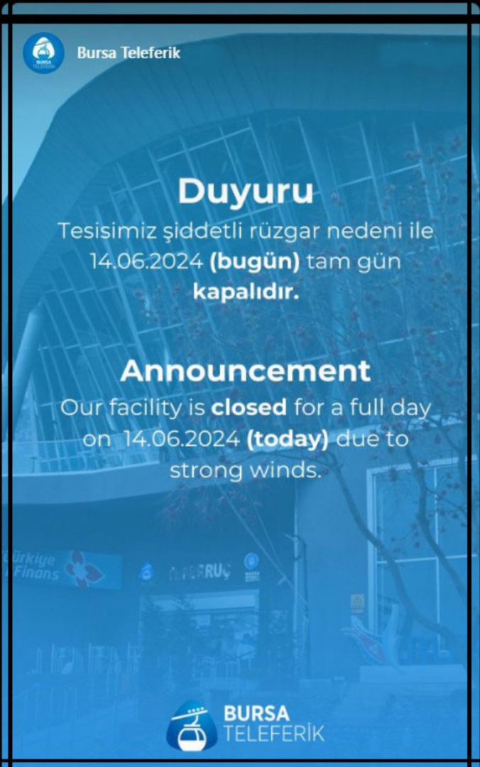 Bursa Teleferik A.Ş.’den yapılan açıklamada "Tesisimiz şiddetli rüzgar nedeni ile 14.06.2024 (bugün) tam gün kapalıdır." denildi.