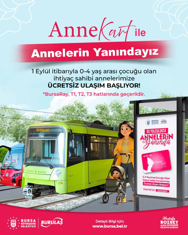 Ücretsiz ulaşım imkanı sunan AnneKart sadece BursaRay, T1, T2 ve T3 hatlarında geçerli olacak.
