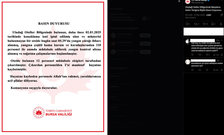"Basın yayın kuruluşlarında yer alan ’Bursa Uludağ’da Kapatılan Otelde Yangın’ haberine konu olayla ilgili olarak Cumhuriyet Başsavcılığımızca başlatılan soruşturma kapsamında; 27.03.2025 tarihinde Uludağ Milli Parkında bulunan konaklama tesisinde meydana gelen yangında personel olduğu değerlendirilen 1 vatandaşımızın olay yerinde, 1 vatandaşımızın ise kaldırıldığı hastanede hayatını kaybettiği ve 1 vatandaşımızın yaralandığı olayla ilgili olarak; Olay yerinde, 1 Cumhuriyet Başsavcı Vekili ve 2 Cumhuriyet Savcısı görevlendirildiği, bilirkişi marifetiyle yangının çıkış sebebi ve sorumluların tespiti için incelemelerin devam ettiği, Cumhuriyet Başsavcılığımızca soruşturmanın titizlikle yürütüldüğü, soruşturmanın safahatı ve sonucu hakkında bilgi verileceği hususu kamuoyuna saygıyla duyurulur."