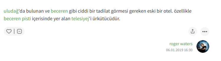 Ekşi Sözlük’te 2019 yılında yazılan bir yorumda, Uludağ’daki eski bir otelin ciddi tadilat ihtiyacı olduğuna dikkat çekilerek özellikle Beceren Pisti içerisinde yer alan telesiyejin “ürkütücü” olduğu yönünde ifadeler kullanıldığı görüldü.