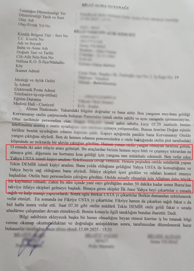Bursa Uludağ'daki Kervansaray Otel yangını davasında itfaiyenin müdahalesine ilişkin su bulunmadığı iddiası gündem oldu, Üsta ailesinin hayatını kaybettiği olayda yargılama sürüyor.