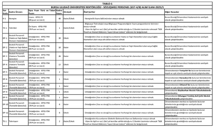 Bursa Uludağ Üniversitesi hastanesinde çalışmak üzere farklı pozisyonlarda personel alınacak.