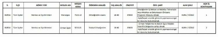 Yayımlanan ilanda bir marangoz ve orman işçisi alınacağı belirtildi.