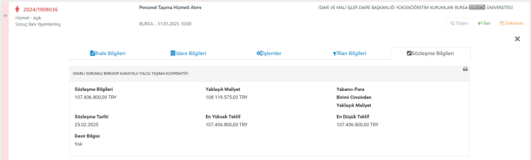 İhaleye tek teklif sunan Sınırlı Sorumlu Birkoop Karayolu Yolcu Taşıma Kooperatifi ile Uludağ Üniversitesi, 25 Şubat tarihinde 107 milyon 436 bin 800 TL'lik sözleşme imzaladı.