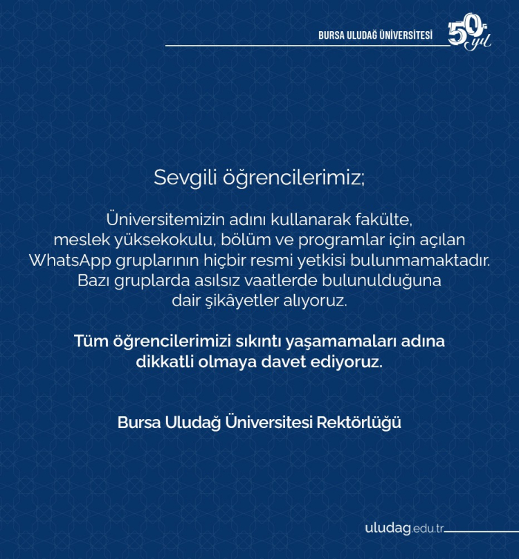 Yapılan açıklamada, "Sevgili öğrencilerimiz; Üniversitemizin adını kullanarak fakülte, meslek yüksekokulu, bölüm ve programlar için açılan WhatsApp gruplarının hiçbir resmi yetkisi bulunmamaktadır. Bazı gruplarda asılsız vaatlerde bulunulduğuna dair şikâyetler alıyoruz. Tüm öğrencilerimizi sıkıntı yaşamamaları adına dikkatli olmaya davet ediyoruz." ifadeleri kullanıldı.