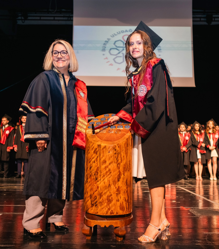BUÜ Rektörü Prof. Dr. Ferudun Yılmaz, Bursa Tabip Odası Başkanı Kadir Binbaş ve UTFAM adına Dr. Hasan Budak dereceye giren dönem birincisi Dr. Elif Bayram, dönem ikincisi Dr. Sude Karabulut ve dönem üçüncüsü Dr. Merve Çarıkçı'ya hediyelerini takdim etti. Tıp Fakültesi 49. Dönem Birincisi Dr. Elif Bayram, Tıp Fakültesi Dekanı Prof. Dr. Funda Coşkun ile birlikte yaş kütüğüne plaket çaktı.