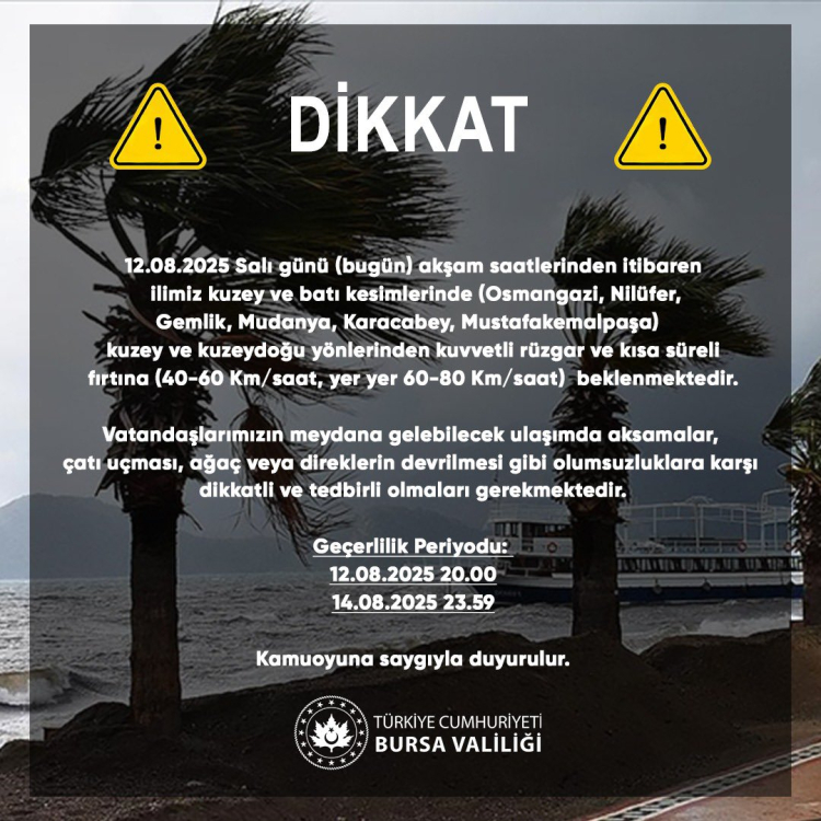 Bursa Valiliği, 12 Ağustos 2025 Salı günü (bugün) akşam saatlerinden itibaren il genelinin kuzey ve batı kesimlerinde (Osmangazi, Nilüfer, Gemlik, Mudanya, Karacabey, Mustafakemalpaşa) kuvvetli rüzgar ve kısa süreli fırtına beklendiğini duyurdu.