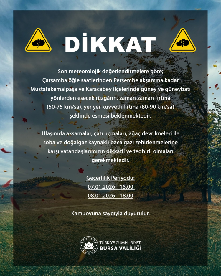 "Son meteorolojik değerlendirmelere göre; Çarşamba öğle saatlerinden Perşembe akşamına kadar Mustafakemalpaşa ve Karacabey ilçelerinde güney ve güneybatı yönlerden esecek rüzgârın, zaman zaman fırtına (50-75 km/sa), yer yer kuvvetli fırtına (80-90 km/sa) şeklinde esmesi beklenmektedir.