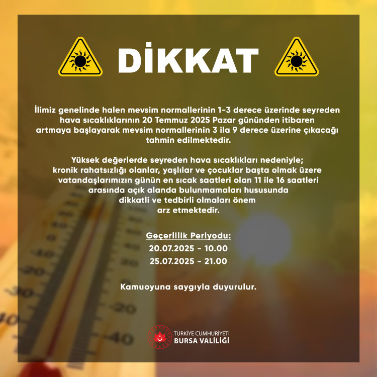 Bursa Valiliği'nden kavurucu sıcak uyarısı! Günlerce sürecek: Saat verildi
