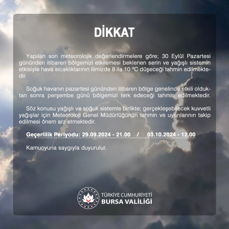 “Yapılan son meteorolojik değerlendirmelere göre; 30 Eylül Pazartesi gününden itibaren bölgemizi etkilemesi beklenen serin ve yağışlı sistemin etkisiyle hava sıcaklıklarının ilimizde 8 ila 10°C düşeceği tahmin edilmektedir.