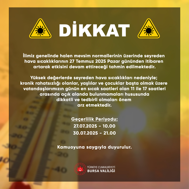 Bursa Valiliği'nden yüksek sıcaklık uyarısı! Gün verildi, o saatlere dikkat...