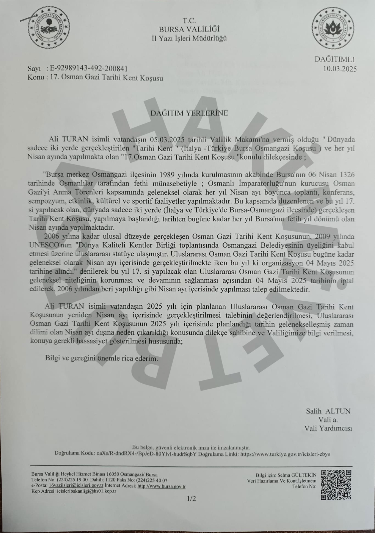 Bursa Valisi Yardımcısı Salih Altun'un imzasıyla gönderilen yazıda, "Ali Turan isimli vatandaşın 2025 yılı için planlanan Uluslararası Osmangazi Tarihi Kent Koşusunun yeniden Nisan Ayı içerisinde gerçekleştirilmesi talebinin değerlendirilmesi, Uluslararası Osmangazi Gazi Tarihi Kent Koşusu'nun 2025 yılı içerisinde planlandığı tarihin gelenekselleşmiş zaman dilimi olan Nisan ayı dışına neden çıkarıldığı konusunda dilekçe sahibine ve Valiliğimze bilgi verilmesi, konuya gerekli hassasiyet gösterilmesi hususunda; Bilgi ve gereğini önemle rica ederim." ifadeleri kullanıldı.