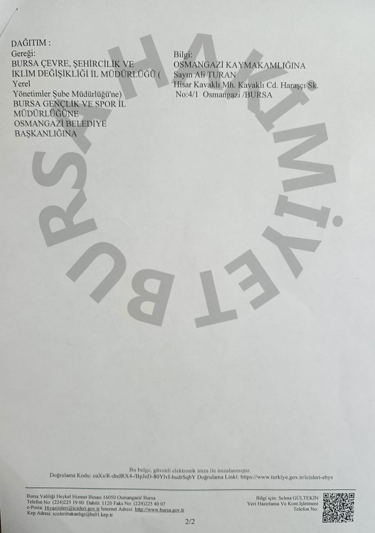 Söz konusu yazı; Bursa Çevre, Şehircilik ve İklim Değişikliği İl Müdürlüğü (Yönetimler Şube Müdürlüğü'ne), Bursa Gençlik ve Spor İl Müdürlüğü'ne ve Osmangazi Belediye Başkanlığı'na gönderildi.