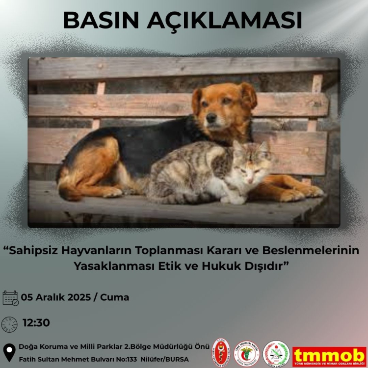 Bursa Veteriner Hekimler Odası, 5 Aralık 2025 Cuma günü saat 12:30'da Doğa Koruma ve Milli Parklar 2.Bölge Müdürlüğü önünde “Sahipsiz Hayvanların Toplanması Kararı ve Beslenmelerinin Yasaklanması Etik ve Hukuk Dışıdır” konulu basın açıklaması yapacağını duyurdu.