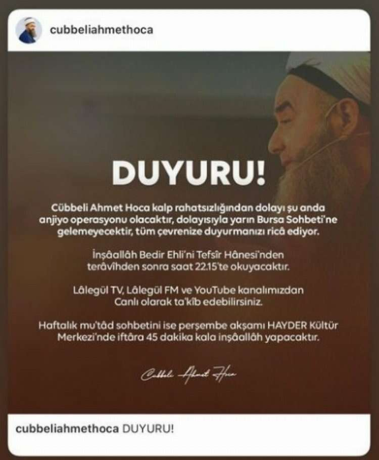 Cübbeli Ahmet Hoca kalp rahatsızlığından dolayı şu anda anjiyo operasyonu olacaktır, dolayısıyla yarın Bursa Sohbeti'ne gelemeyecektir, tüm çevrenize duyurmanızı ricâ ediyor.