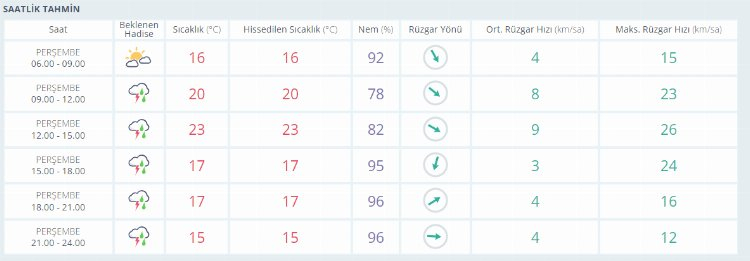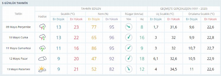 CUMA gökgürültülü sağanak yağışlı 22 derece, CUMARTESİ sağanak yağışlı 16 derece, PAZAR çok bulutlu ve güneşli 20 derece, PAZARTESİ ise parçalı bulutlu ve güneşli 21 derece olacak.