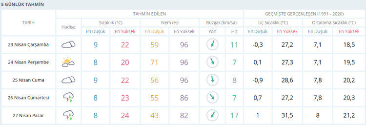 PERŞEMBE parçalı bulutlu ve 20 derece CUMA bulutlu 22 derece CUMARTESİ gök gürültülü sağanak yağışlı 23 derece PAZAR gök gürültülü sağanak yağışlı 24 derece olması bekleniyor.