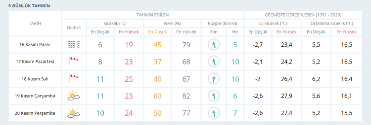 17 Kasım Pazartesi: Kentte bol güneş ışığının etkili olması bekleniyor. Gündüz sıcaklığı 22 °C, gece sıcaklığı 12 °C civarında seyredecek.