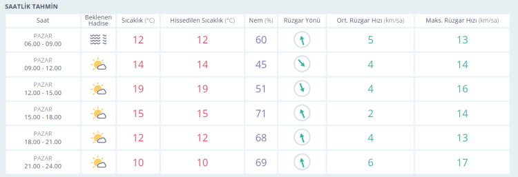 Meteorolojik verilere göre saat 09.00’da aralıklı bulutlarla birlikte 7 derece civarında seyreden hava sıcaklığı, 11.00 itibarıyla 14 dereceye kadar çıkacak. Öğle saatlerinden sonra ise Bursa günün en sıcak anlarını yaşayacak. 13.00–15.00 arasında sıcaklık 17–19 derece aralığında olurken ve kentte güneş etkisini arttırıyor.