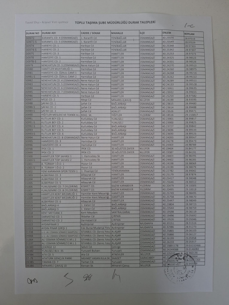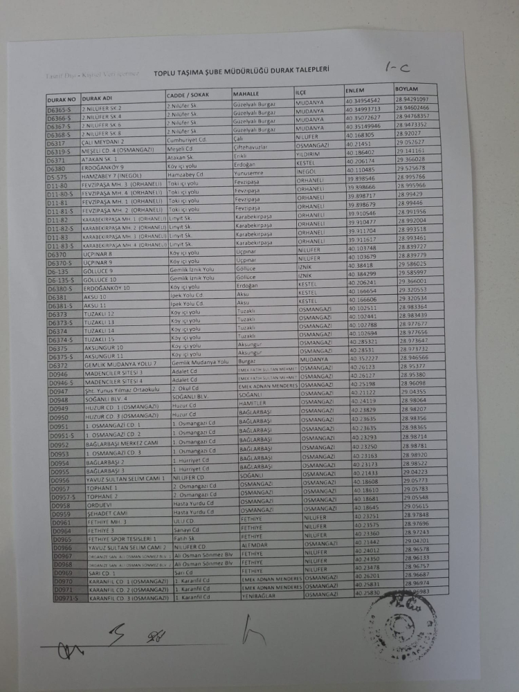 Osmangazi, Yıldırım, Nilüfer, Kestel, İznik, Orhaneli, İnegöl, Karacabey, Mudanya ve Yıldırım ilçelerindeki 34 mahallede kurulması planlanan otobüs duraklarının listesinin uygun olduğuna karar verildi.
