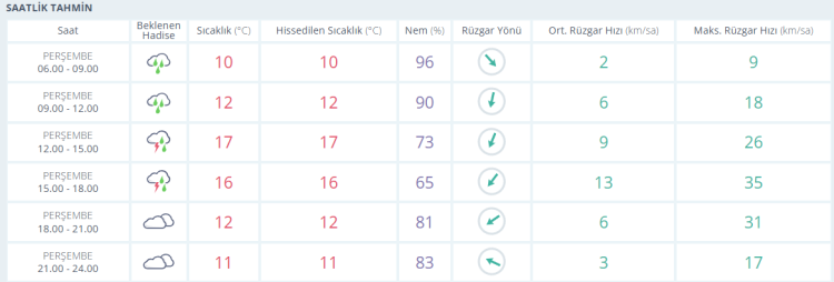 Akşam saatlerine doğru ise termometreler 16 derece ve gök gürültülü sağanak yağış gösteriyor.