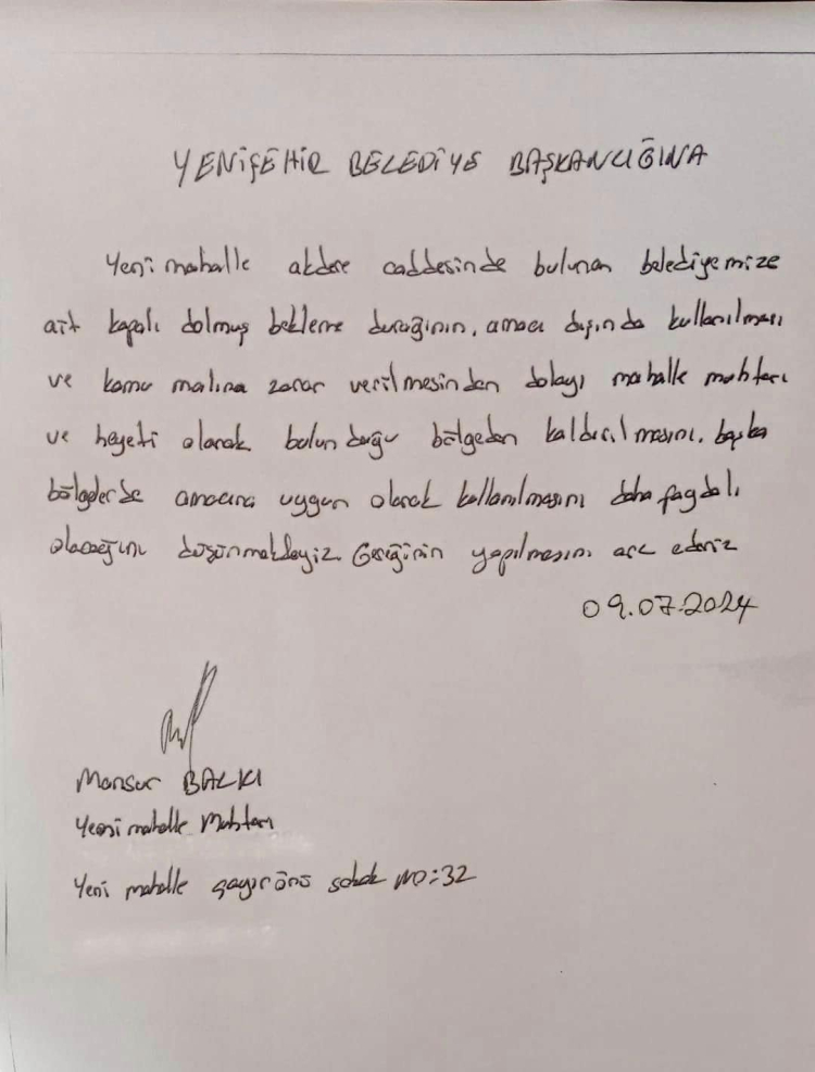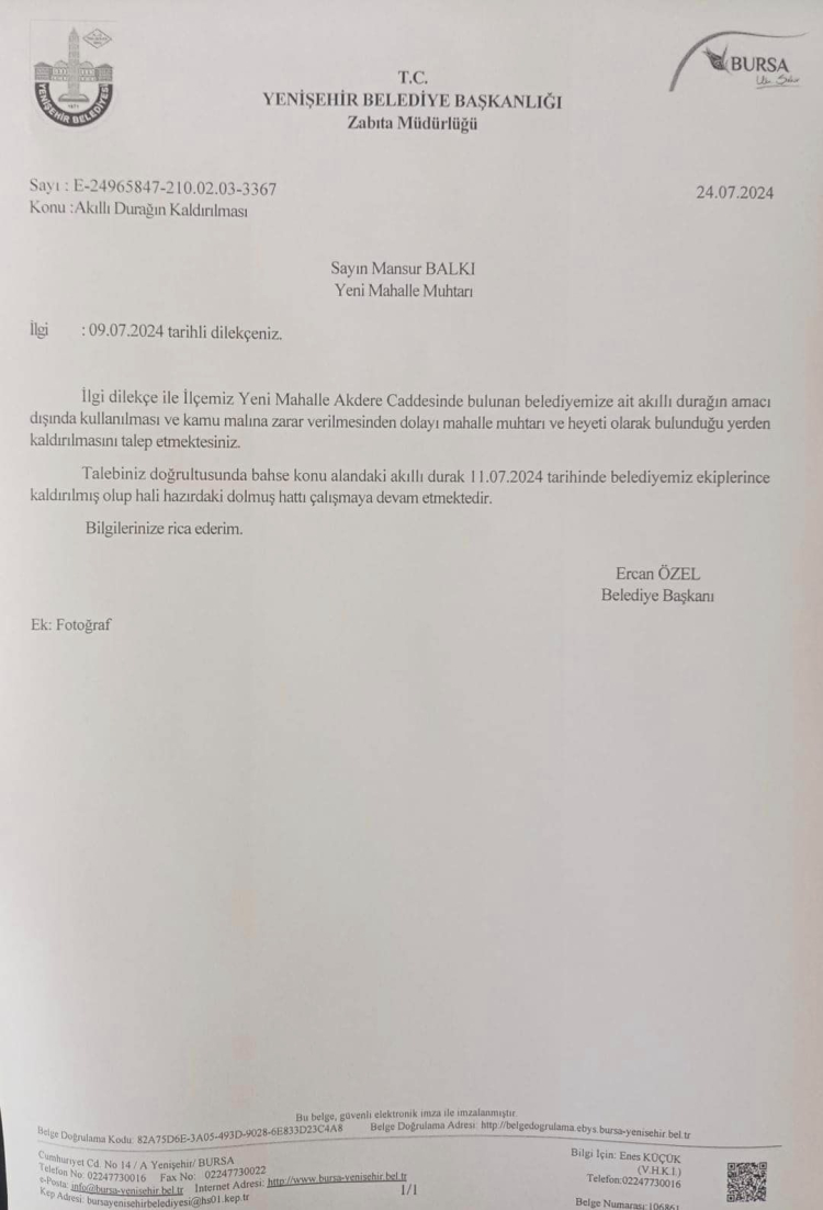 Başkan Özel, 9 Temmuz tarihinde Yeni Mahalle muhtarı Mansur Balkı'nın, Yediyol Meydanında bulunan akıllı durağın amacına uygun olarak kullanılmadığını, sürekli parçalandığını ve zarar verildiğini, geceleri alkol ve madde bağımlılarının uğrak yeri haline geldiğini, emniyet güçlerinin çare bulamadığını, mahalle halkı ve özellikle kadınlar tarafından ciddi şikayetler ve talepler olduğu gerekçesiyle kaldırılmasını ve amacına uygun bir yerde hizmet vermesi için değerlendirilmesini resmi dilekçe ile yazılı ve sözlü olarak belediyeden talep ettiğini açıkladı.