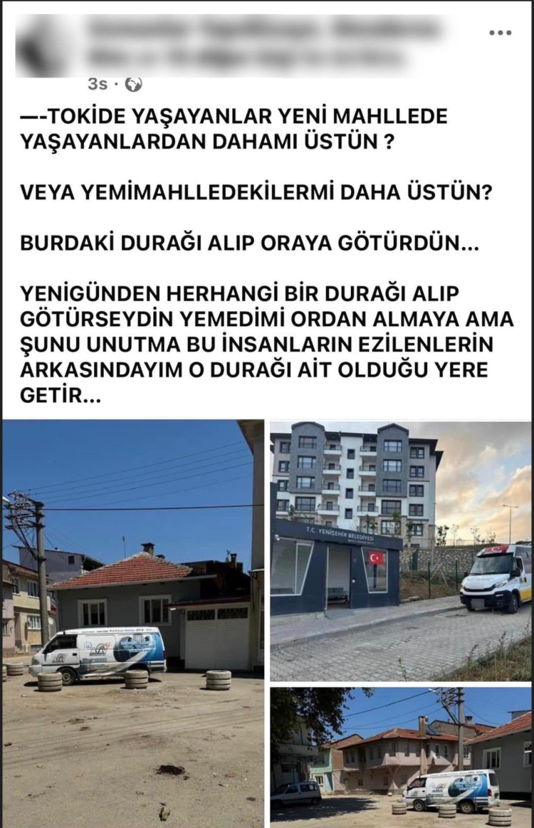 Sosyal medyada gündem olan bir paylaşımda, "TOKİ'de yaşayanlar Yeni mahallede yaşayanlardan daha mı üstün yeya Yeni mahalledekiler mi daha üstün? Buradaki durağı alıp oraya götürdün… Yenigün'den herhangi bir durağı alıp götürseydin yemedi mi ordan almaya? Ama şunu unutma bu insanların ezilenlerin arkasındayım o durağı ait olduğu yere getir…" ifadeleri kullanıldı.
