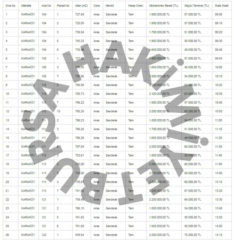 Arsaların en ucuzu 700 bin TL'den en pahalısı 2 milyon 500 bin TL'den ihale edilecek. İhaleden en az 62 milyon 570 bin TL gelir bekleniyor.