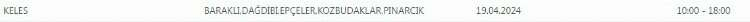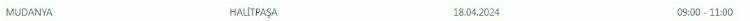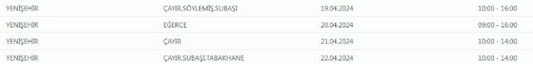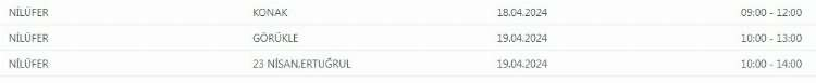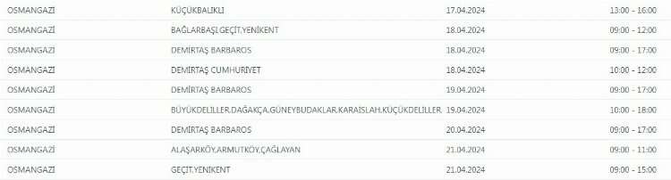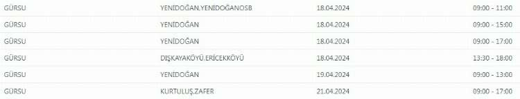 Elektrik dağıtım şirketi UEDAŞ, Bursa için yayınladığı duyuruda, "Şebeke çalışması sebebiyle Bursa'da belirtilen adreslerde enerji kesintisi uygulanacaktır. Yapılacak olan çalışmanın erken bitmesi halinde planlanan bitiş saatinden önce enerji verilecektir." ifadelerini kullandı.
