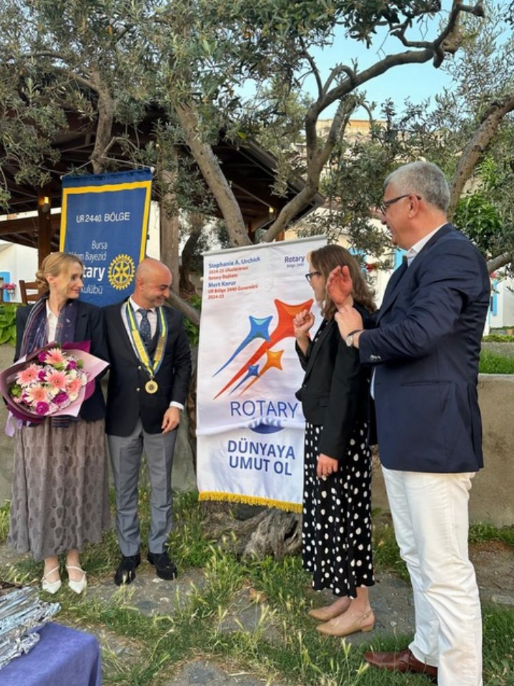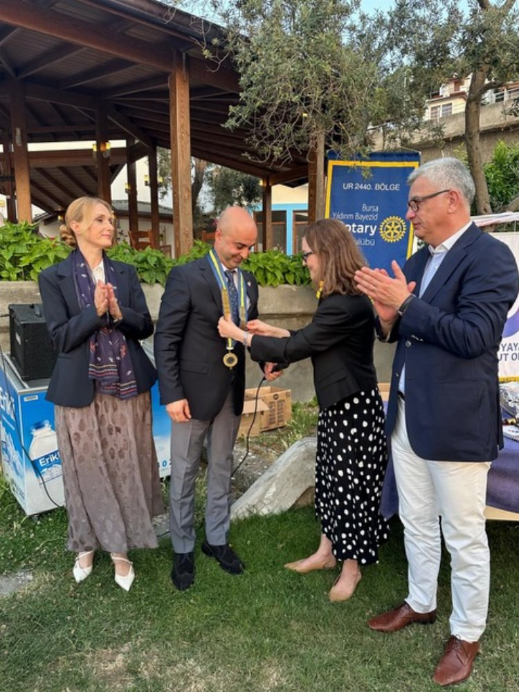 Yıldırım Bayezid Rotary Kulübü 2023-2024 Dönemi Başkanı Yeşim Çarıkçı Bayram başkanlık kolyesini Gökmen Geyik’e teslim etti.