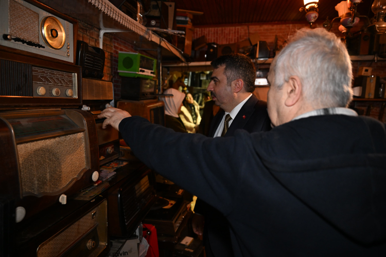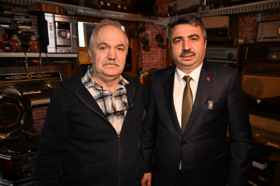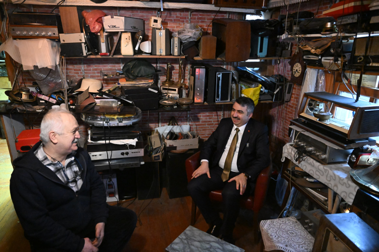 Yıldırım Belediye Başkanı Oktay Yılmaz, Bursa'da Yeşil Caddesi'ndeki atölyesinde 40 yıldır eski radyo ve gramofonları tamir edip çalışır hale getiren son usta 'Nostalji Doktoru' olarak tanınan Ahmet Ali Şağın'ın (63) misafiri oldu. Şağın ile sohbet eden Başkan Oktay Yılmaz, atölyede bulunan radyo, gramofon ve müzik dolaplarını inceledi.