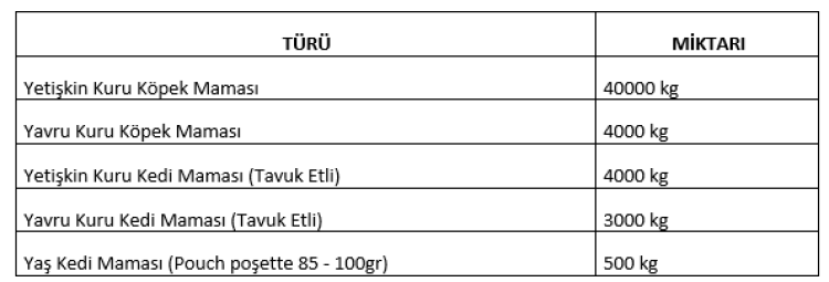 İhaleyi kazanan firma; 40 ton yetişkin kuru köpek maması, 4 ton yavru köpek maması, 4 ton yetişkin kuru kedi maması (tavuk etli), 3 ton yavru kuru kedi maması (tavuk etli) ve 500 kilogram yaş kedi mamasını (pouch 85-100 gram paket) Yıldırım Belediyesi Veteriner İşleri Müdürlüğü'ne teslim edecek.