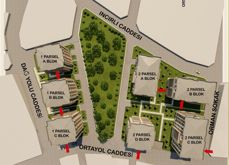 Onaylı imar planında konut imarlı iki yapı adası ve park alanı yer alan proje alanında iki ayrı konut imarlı yapı adasında olacak şekilde toplamda 7 adet blok, 238 bağımsız bölüm bulunacak.