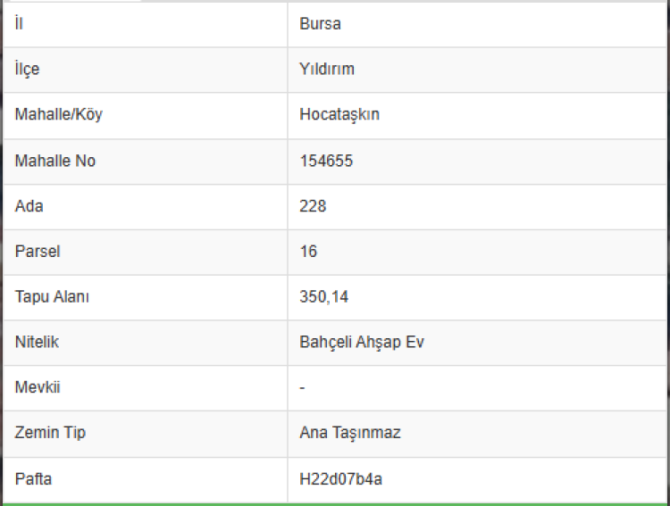 Yıldırım ilçesi'ne bağlı Hocataşkın Mahallesi'nde bulunan, 228 ada 16 parsel sayılı 350,14 metrekarelik bahçeli ahşap evinhissedarları olan Saide, Selime, Memiş ve Hamdi isimli sahiplerin gaipliğine kararı verilmesi talebiyle dava açıldı.