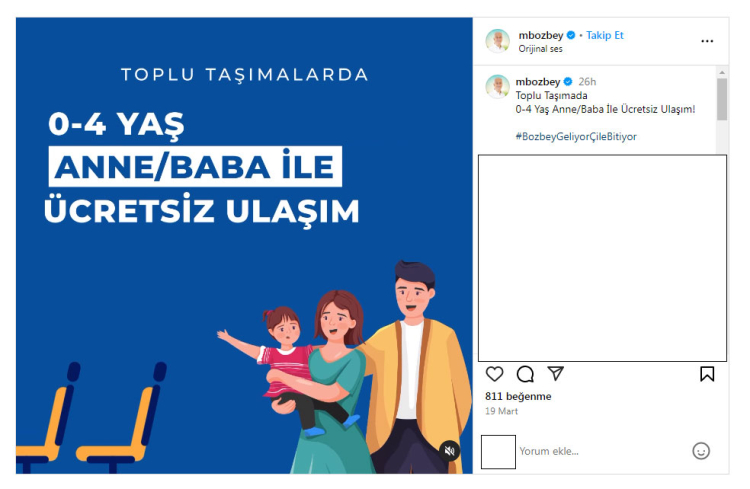 BURBAK noktalarına park eden araçlardan ücret alınmaması, su fiyatlarına ve öğrenci biletlerine indirim sözlerini tutan Başkan Bozbey, 0-4 yaş arasındaki çocuğuyla beraber toplu taşımaya binen anne ya da babanın ulaşımdan ücretsiz yararlanacağını müjdelemişti.