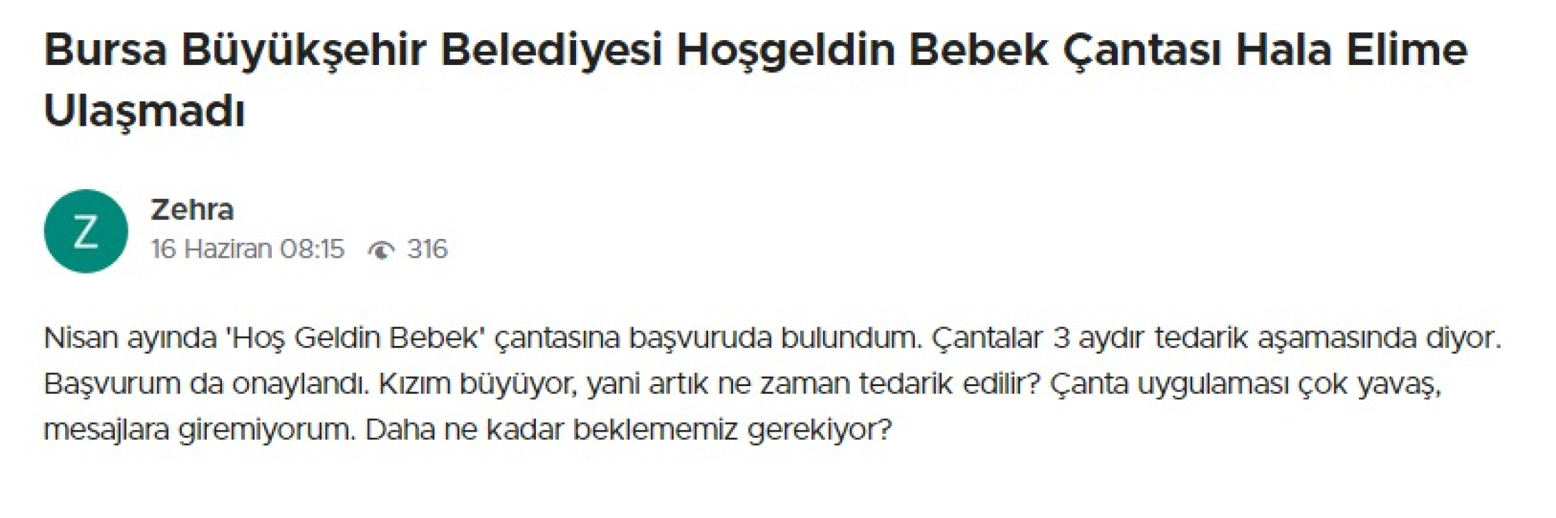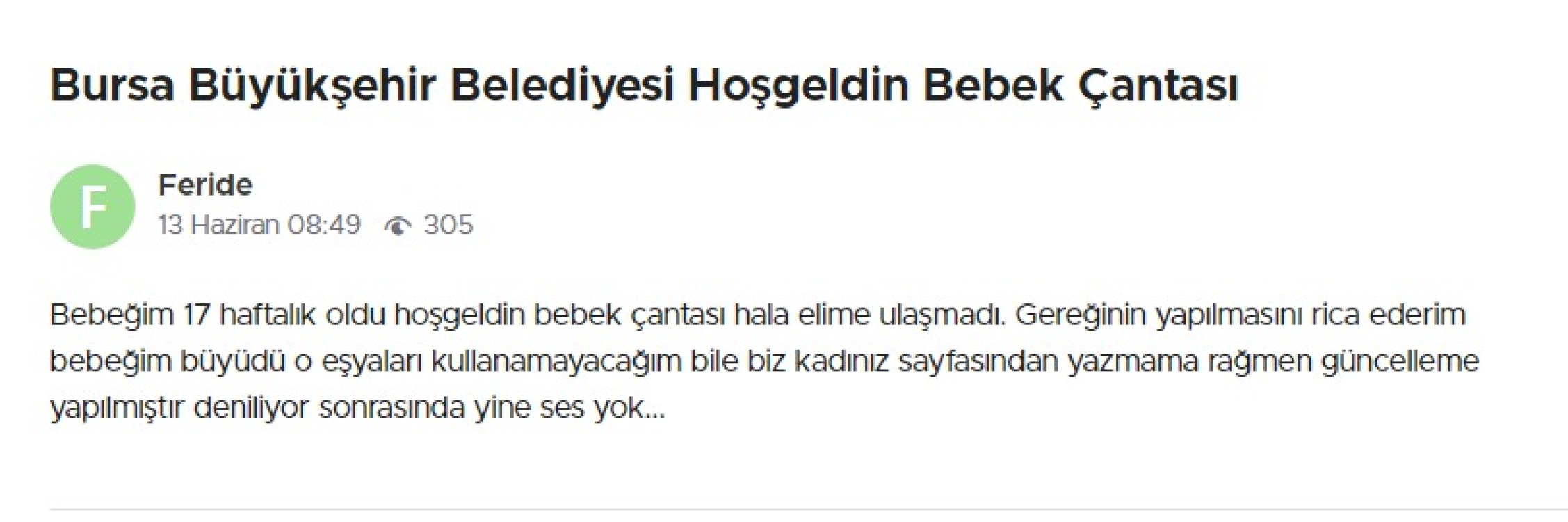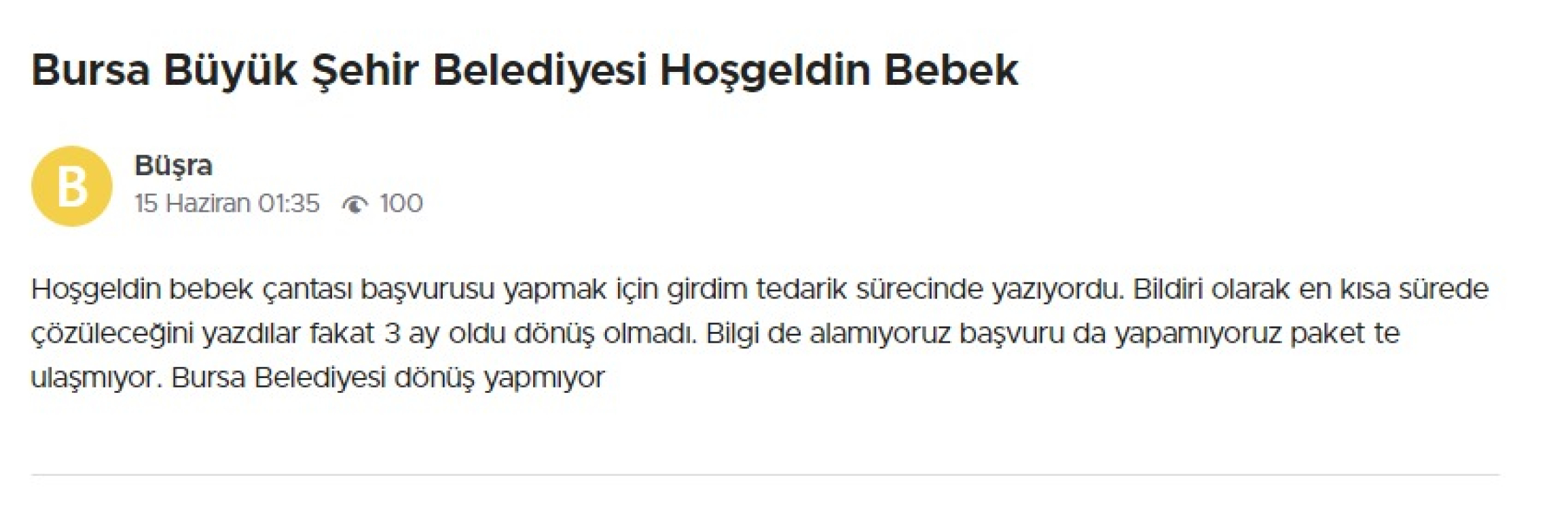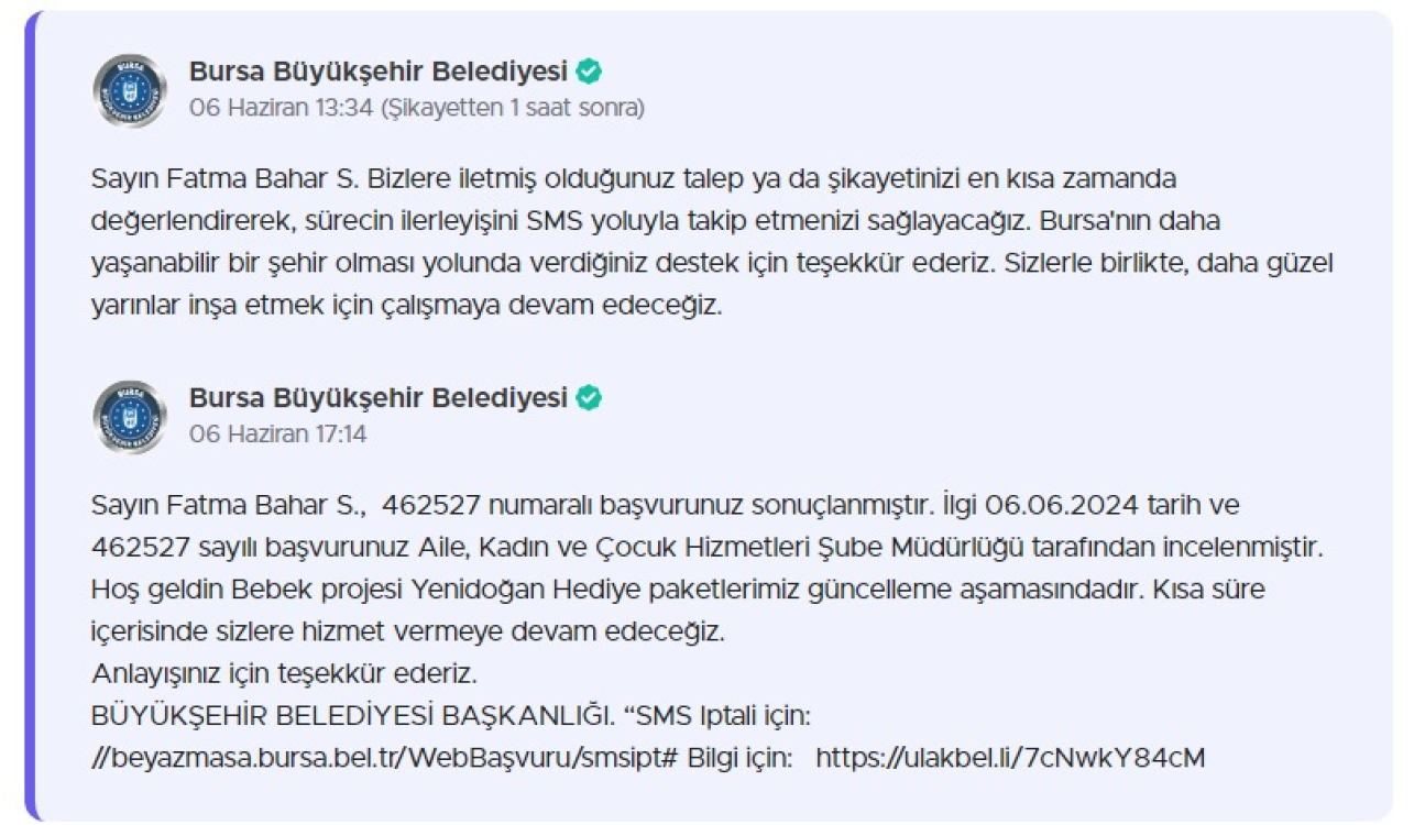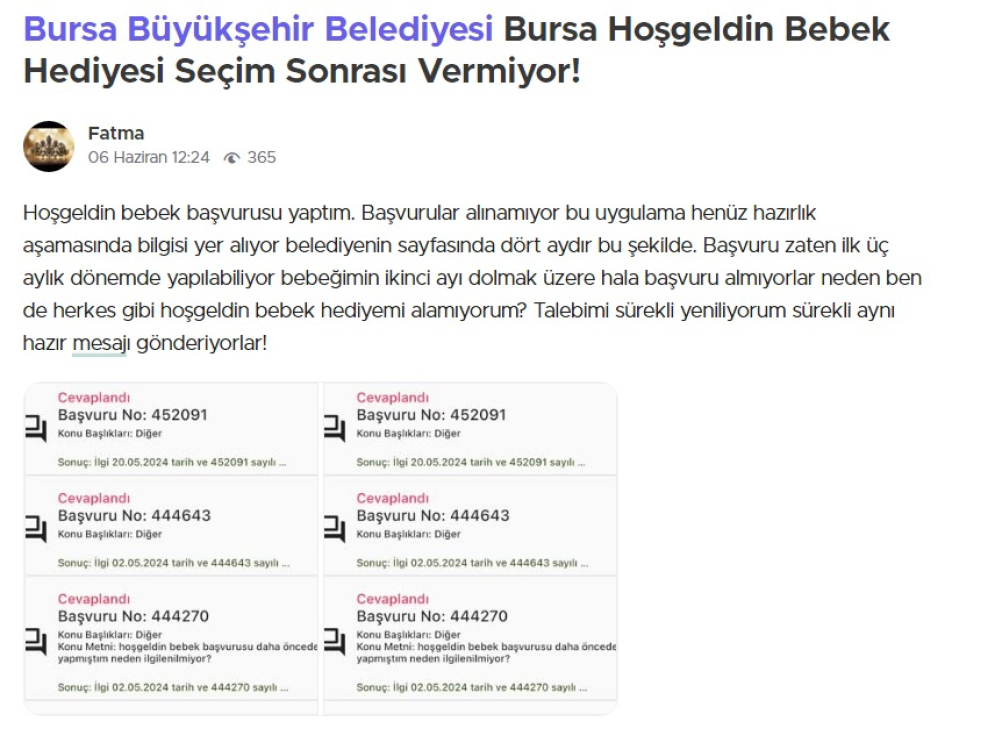 Şikayetvar üzerinden 4 aydır Hoşgeldin Bebek Paketini almadığını ifade eden bir anneye, Bursa Büyükşehir yetkilileri şu cevabı verdi: