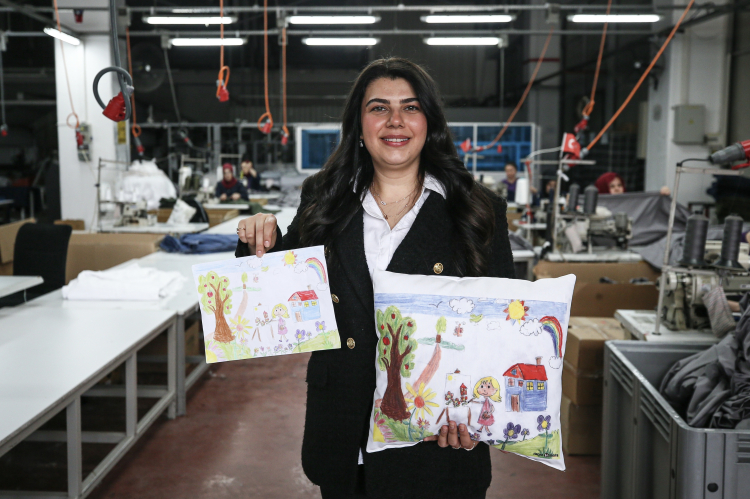Bursa'daki bir holding bünyesinde hayata geçirilen proje kapsamında 100'ün üzerinde çocuğun yaptığı resimler, anne ve babalarının çalıştığı tekstil fabrikasında üretim sürecinden geçerek yastık kılıflarına basıldı.