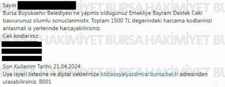 Destek çekleri, vatandaşlara kişiselleştirilerek telefonlarına SMS olarak iletildi. Proje kapsamında Ramazan Bayramı’na kadar toplam 100 bin emekliye destek çekleri ulaştırılacak.
