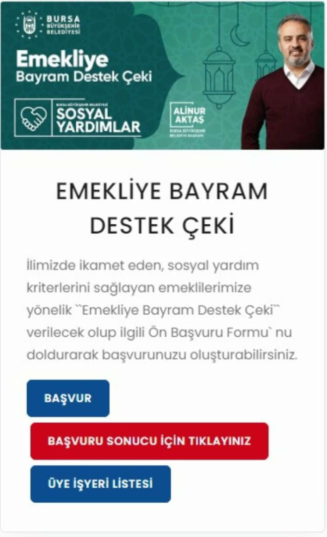 Bursa Büyükşehir Belediye Başkanı Alinur Aktaş, emekliye her iki bayram da olmak üzere bin 500’er TL destek olacaklarını ilan etti.
