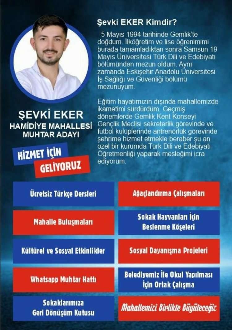 Gemlik’in en renkli mahallelerinden olan Hamidiye Mahallesine yenilikçi bir lider olarak muhtar adayıyım. Genç ve vizyonlu bir öğretmen olarak ,mahallemizin gelişimine katkıda bulunmak, çehresini değiştirmek, kalitesini artırmak ve toplumsal eşitliği sağlamak hedeflerimin arasındadır.