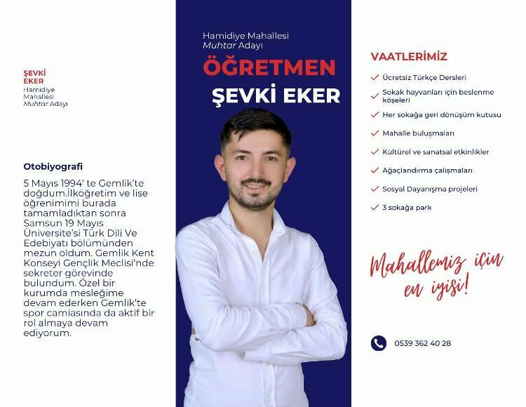 Bursa'da özel bir kurumda öğretmenlik yapan Şevki Eker, Hamidiye Mahallesi muhtar adayı oldu. Eker'in vaatleri arasında ücretsiz Türkçe dersi de yer alıyor...