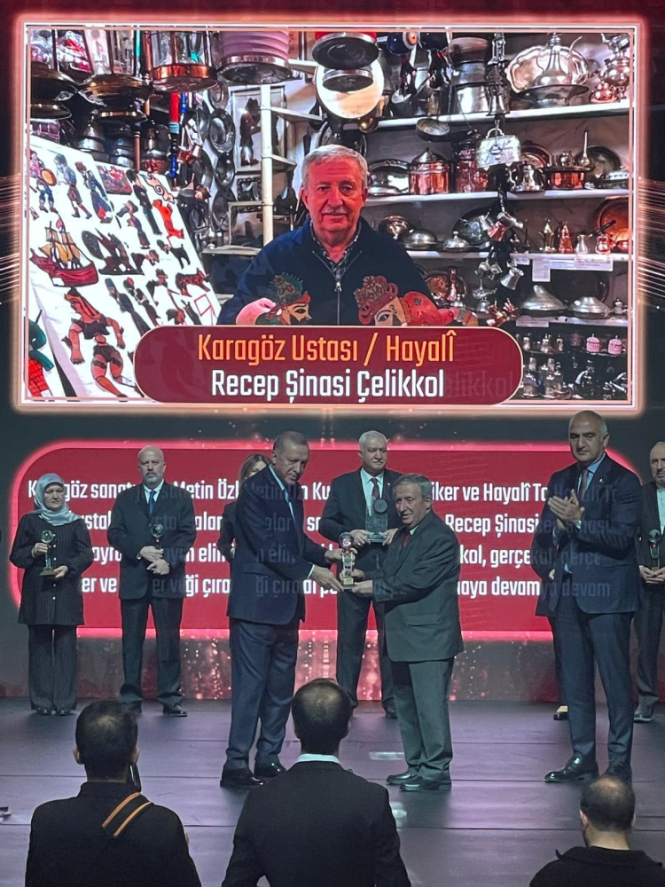 Çini sanatçısı Adil Can Güven ve Hayali sanatçısı / Karagöz ustası Recep Şinasi Çelikkol, ödüllerini Cumhurbaşkanımız Recep Tayyip Erdoğan'ın elinden aldı.