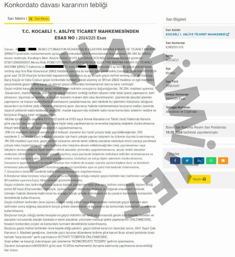 MAHKEME RESMEN DUYURDU: KONKORDATO İLAN EDİLDİ