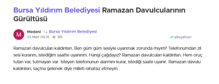 Gece yarısı çıkan sesten rahatsız olan bir vatandaş, Şikayetvar platformu üzerinden davulculuk geleneğinin sürdürülmesine tepki gösterdi.
