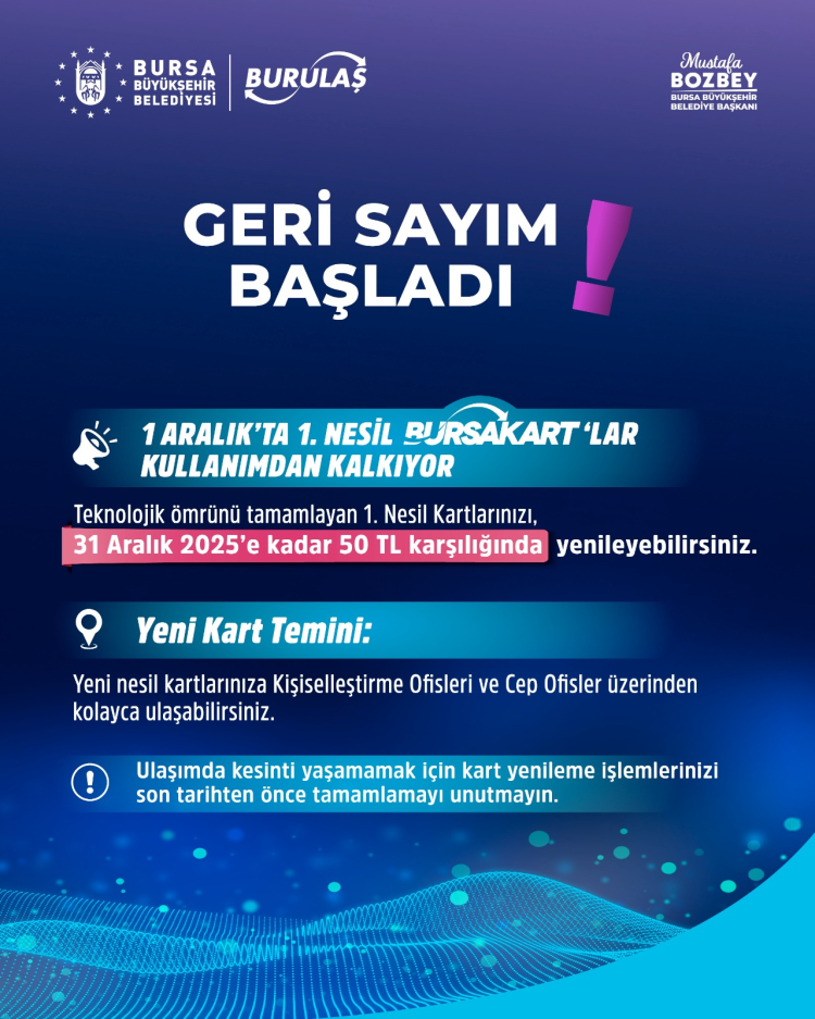 Açıklamada, söz konusu kartlara sahip vatandaşların 1 Aralık 2025’ten itibaren bu kartları kullanamayacağı bildirilirken, ulaşımda sıkıntı yaşanmaması için yenileme işlemlerinin geciktirilmemesi istendi. 1. nesil Bursakart sahipleri, kartlarını 31 Aralık 2025’e kadar 50 TL karşılığında yeni nesil kartlarla değiştirebilecek. Vatandaşlar yeni nesil kartlarını kişiselleştirme ofisleri, cep ofisler üzerinden temin edebilecek.BURULAŞ, vatandaşların ulaşımda aksama yaşamaması için kart yenileme işlemlerini son tarihler gelmeden tamamlamaları gerektiğini hatırlattı.