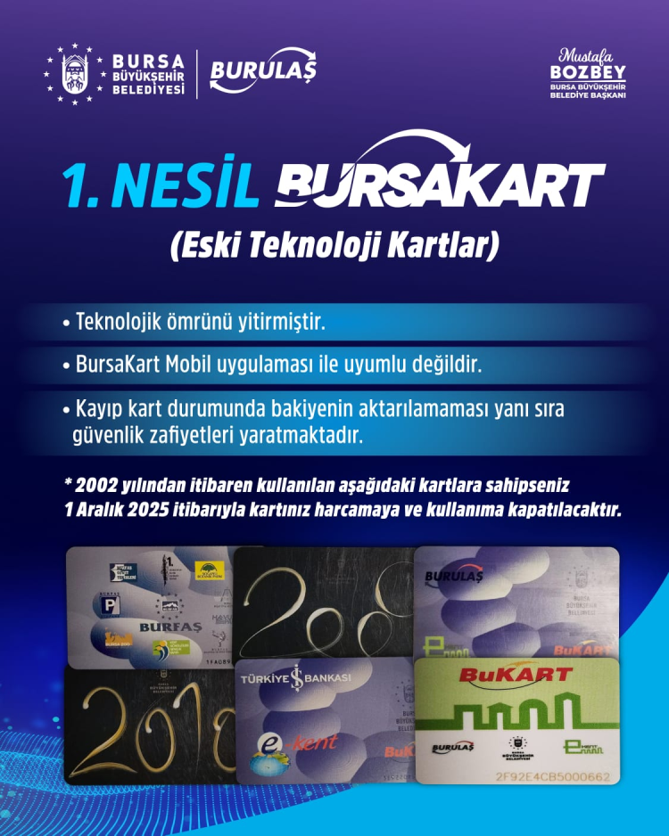 Bursa Büyükşehir Belediyesi ve BURULAŞ, kentte 2002 yılından bu yana kullanılan 1. nesil Bursakartların teknolojik ömrünü tamamlaması nedeniyle kullanımdan kaldırılacağını duyurdu. Buna göre eski teknolojiye sahip tüm kartlar, 1 Aralık 2025 tarihi itibarıyla ulaşımda geçerliliğini yitirecek.