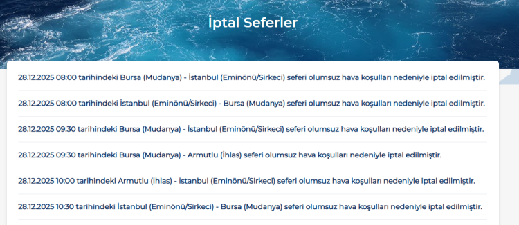 Bursa Deniz Otobüsleri'nden (BUDO) yapılan yazılı açıklamaya göre, çok sayıda sefer iptal edildi.