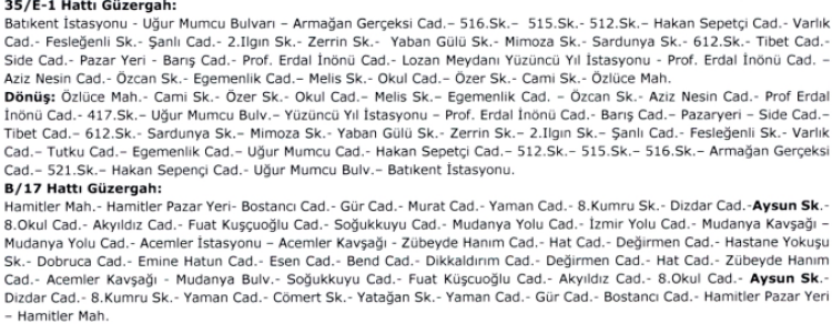 Yapılan açıklamada, "35/E-1, B/17, 812/T, 814, 817 ve 801/B hatlannda güzergah revizyonu yapılmasının uygun olduğuna oy birliği ile karar verilmiştir." ifadeleri kullanıldı.