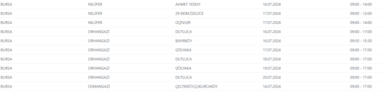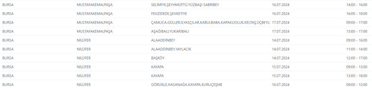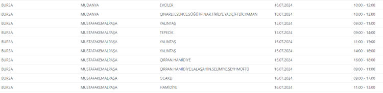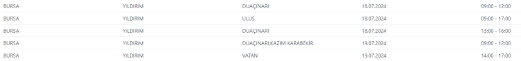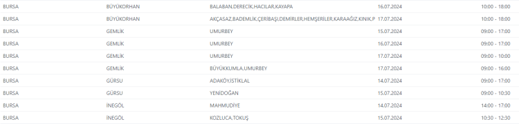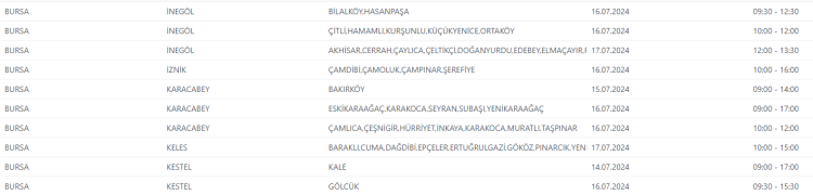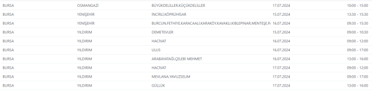 Kesintiler Bursa'nın Büyükorhan, Gemlik, Gürsu, İnegöl, İznik, Karacabey, Keles, Mustafakemalpaşa, Kestel, Mudanya, Nilüfer, Orhangazi, Osmangazi, Yenişehir ve Yıldırım ilçelerindeki bazı noktalarında meydana gelecek.
