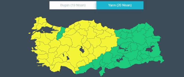 Kuvvetli yağış beklenen, Aydın, Balıkesir, Bursa, Çanakkale, Edirne, İstanbul, İzmir, Kırklareli, Kocaeli, Manisa, Tekirdağ, Yalova, kuvvetli yağış ve fırtına beklenen, Antalya, Burdur, Denizli, Isparta, Kütahya, Muğla, kuvvetli rüzgar beklenen, Afyonkarahisar, Amasya, Ankara, Bolu, Çankırı, Çorum, Eskişehir, Kastamonu, Kayseri, Kırşehir, Konya, Nevşehir, Niğde, Ordu, Samsun, Sinop, Sivas, Tokat, Uşak, Yozgat, Zonguldak, Aksaray, Karaman, Kırıkkale, Bartın, Karabük ve Düzce için "sarı" kodlu uyarıda bulunuldu.